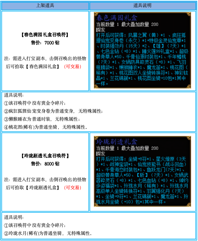 2、【春色满园礼盒召唤符】以及【玲珑剔透礼盒召唤符】仅限钻石商城购买,通过摆摊购买、互相交易、邮件领取、拍卖购买等非钻石商城购买方式获得的,均不计算在活动内;