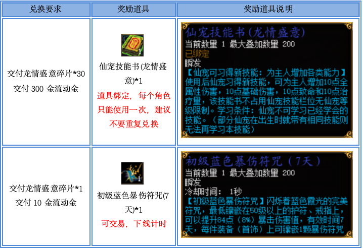 1、兑换奖励中的【仙宠技能书(龙情盛意)】为绑定,且每个角色只能使用1次,因此请勿重复兑换,以免造成损失;
