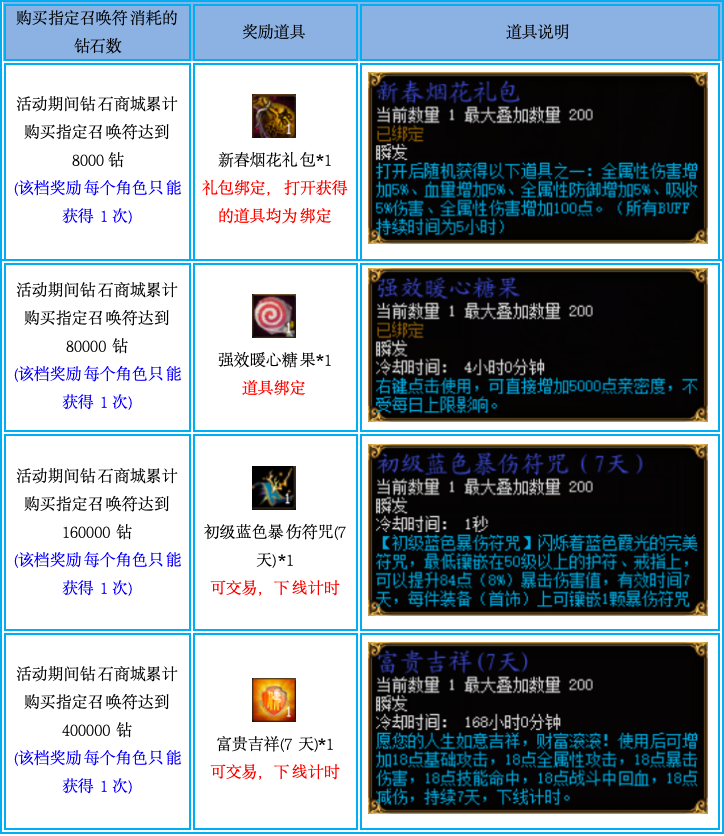 活动期间,单个角色在钻石商城累计购买【春色满园礼盒召唤符】以及【玲珑剔透礼盒召唤符】合计达到指定要求的钻石数量后可获得活动奖励,但每档奖励只能获得1次: