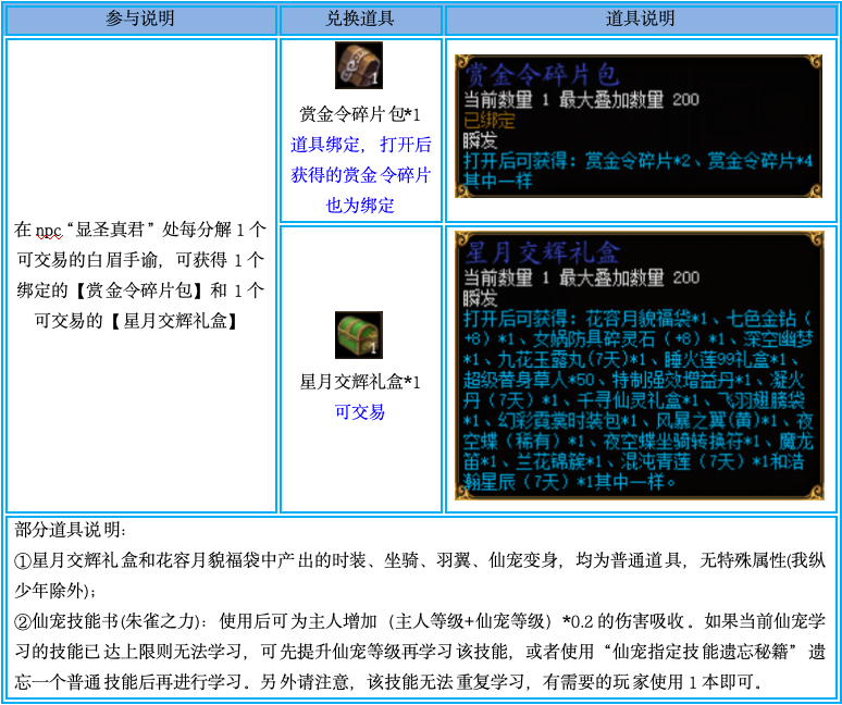 1、活动期间,可在成都npc“显圣真君”处将以下道具进行分解: