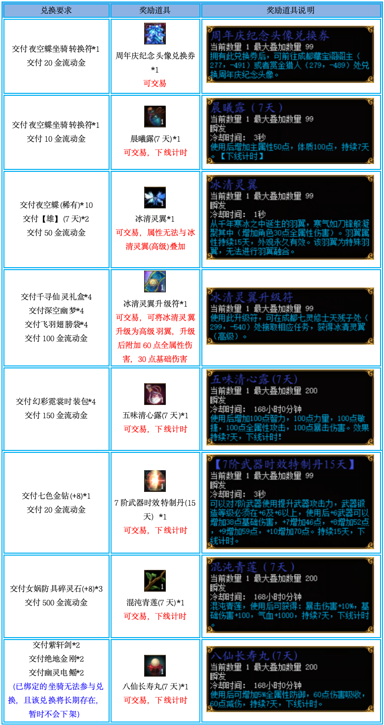 活动期间,可在NPC“藏宝阁阁主”处兑换以下道具:
