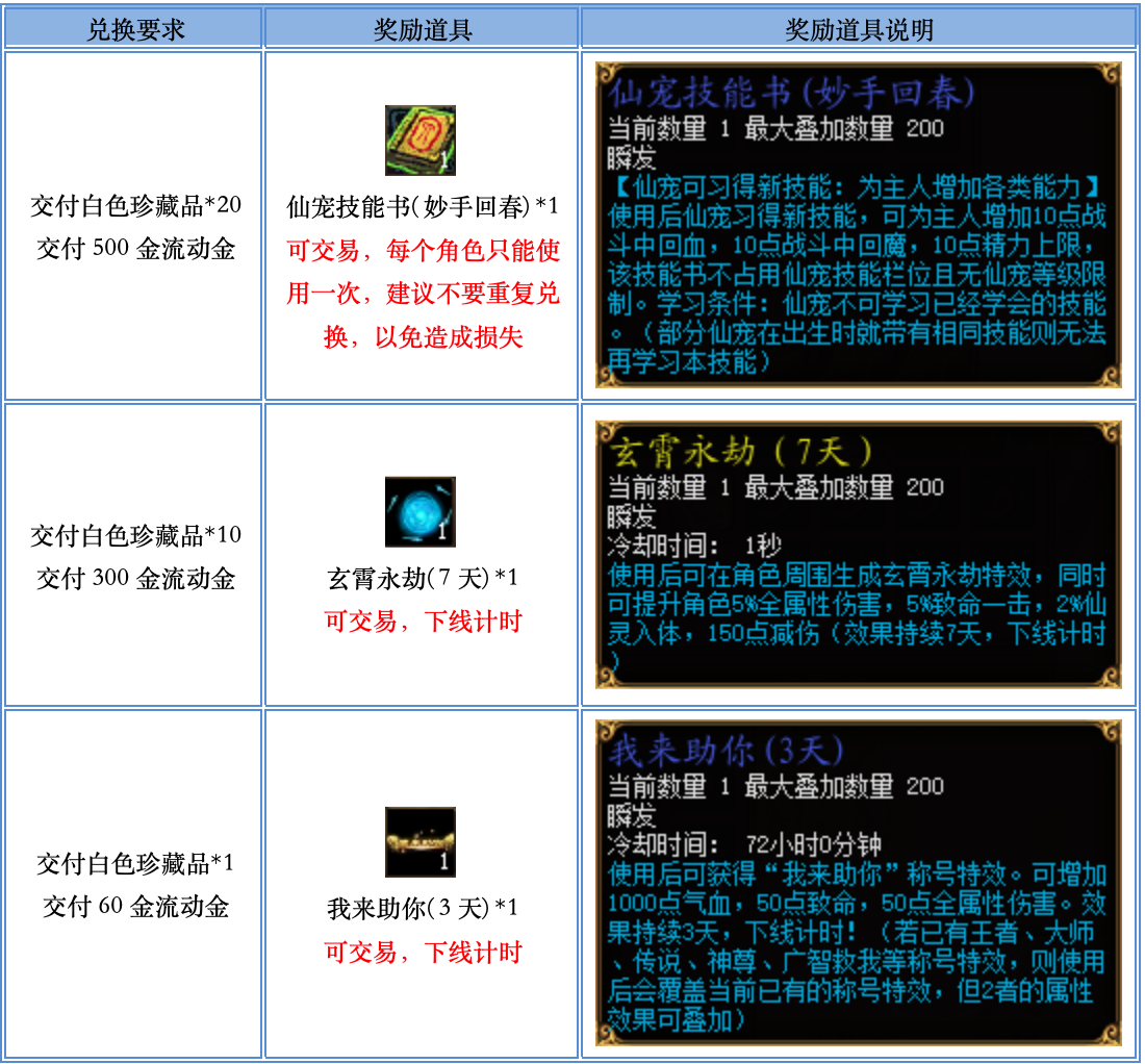 2、活动期间,可在npc“藏宝阁阁主”处兑换以下道具,请有需要的玩家注意活动时间: